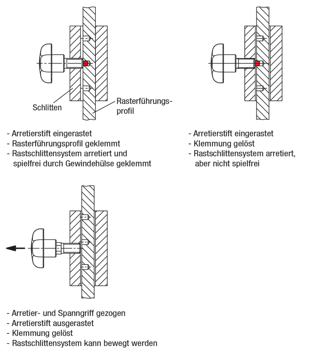 Der Arretier- und Spanngriff ermöglicht das Positionieren, Sichern und Klemmen von diversen Verstellelementen mit nur einem Produkt. Die Arretierung kann formschlüssig mittels Bolzen und die Klemmung kraftschlüssig über die Stirnfläche der Hülse erfolgen.