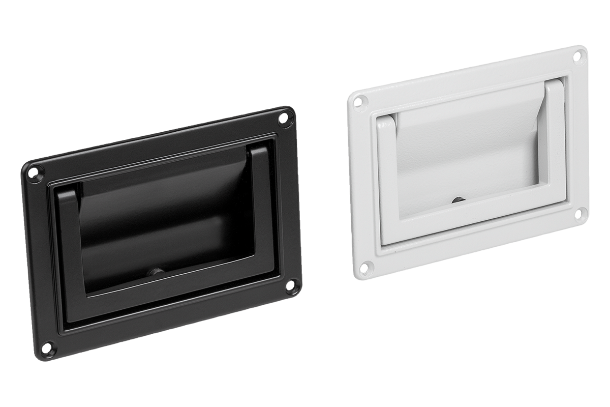 Bei gleichem Gehäuseausschnitt können die Schalengriffe klappbar vor oder hinter der Gehäusewand montiert werden.