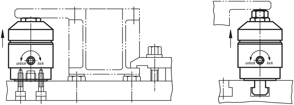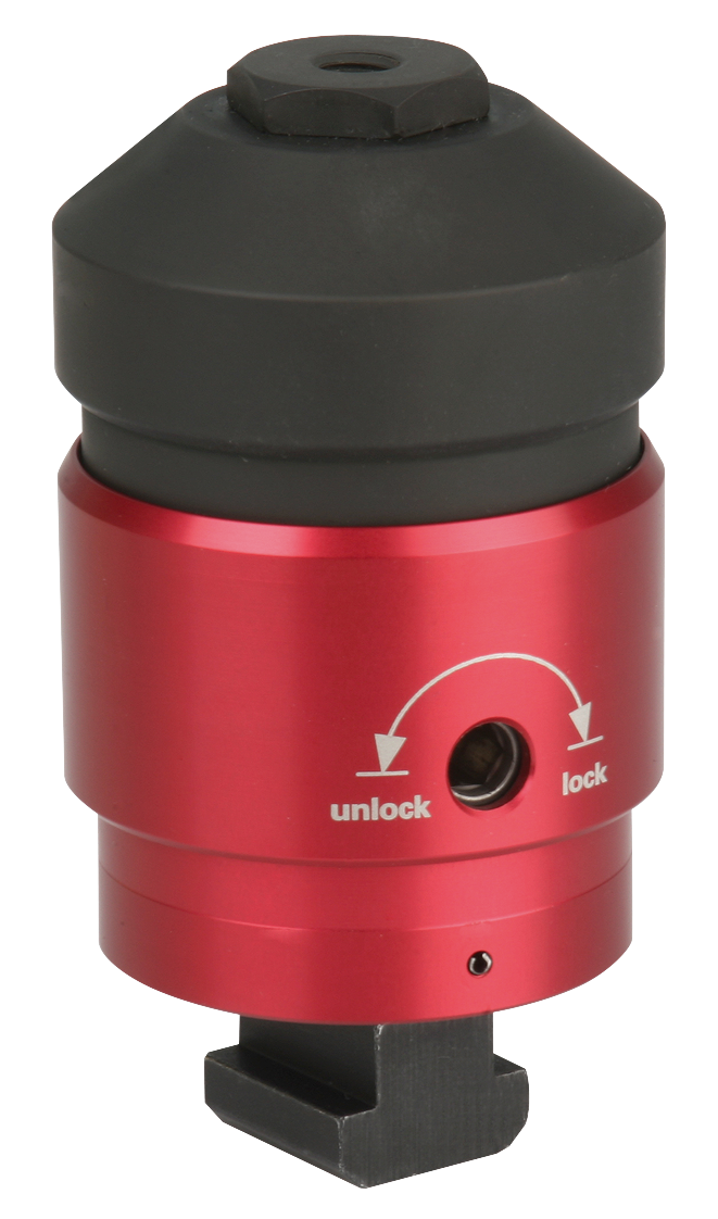 1. Durch Drehen des Spannnockens (Innensechskant SW 6) an der Mantelfläche der roten Schutzhülse legt sich der Stützbolzen mit leichter Federkraft an das Werkstück an. 2. Durch Weiterdrehen bis zum Anschlag (lock) klemmt der Spannmechanismus den Stützbolzen ohne Positionsänderung. 3. Beim Drehen in umgekehrter Richtung (unlock) löst sich die Klemmung. Bei weiterem Zurückdrehen bis zum Anschlag fährt der Stützbolzen in Endstellung.