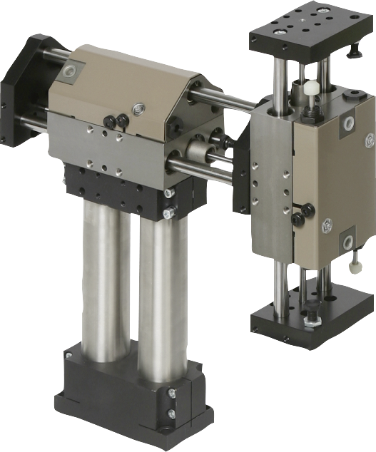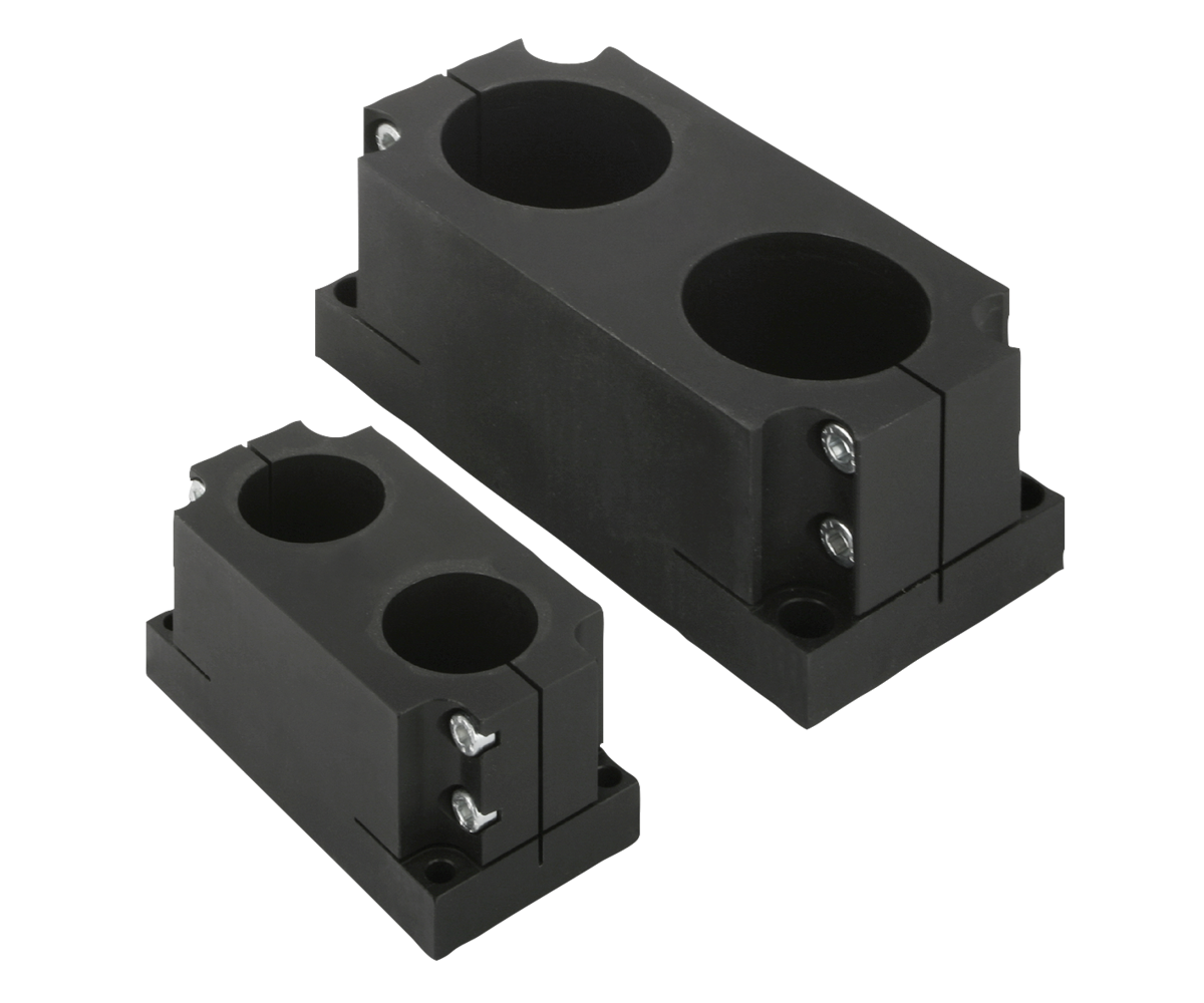 Sockel doppelt zur Aufnahme von Säulen in vier verschiedenen Größen. Bearbeitete Auflageflächen mit integrierten Montage- und Zentrierbohrungen garantieren die positionsgenaue Montage der Elemente.