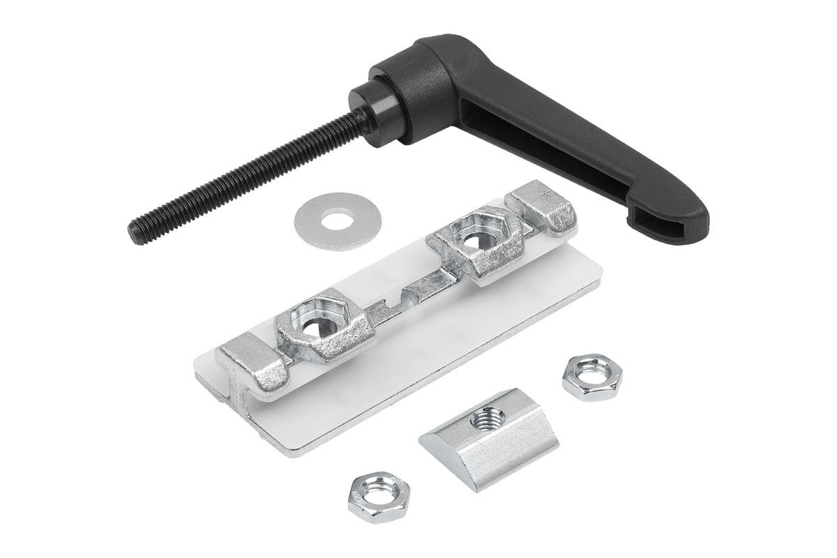Metal profile slider with clipped-on plastic slide element. With an additional clamping lever for clamping the carriage system. Profile sliders enable low-wear linear movement of type I aluminium profiles with 8 mm slots. The absence of lubrication makes the system extremely insensitive to dirt.