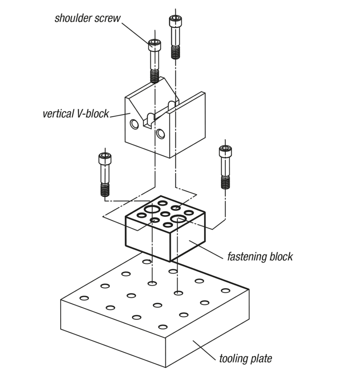 Fastening blocks are used as riser elements in all system elements that have no movable support and contact faces. These include e.g. locating supports 02394, vertical prisms 02388-05-600. They also offer the possibility to position and secure elements within a 50 ±0.01 mm grid (see application example).
