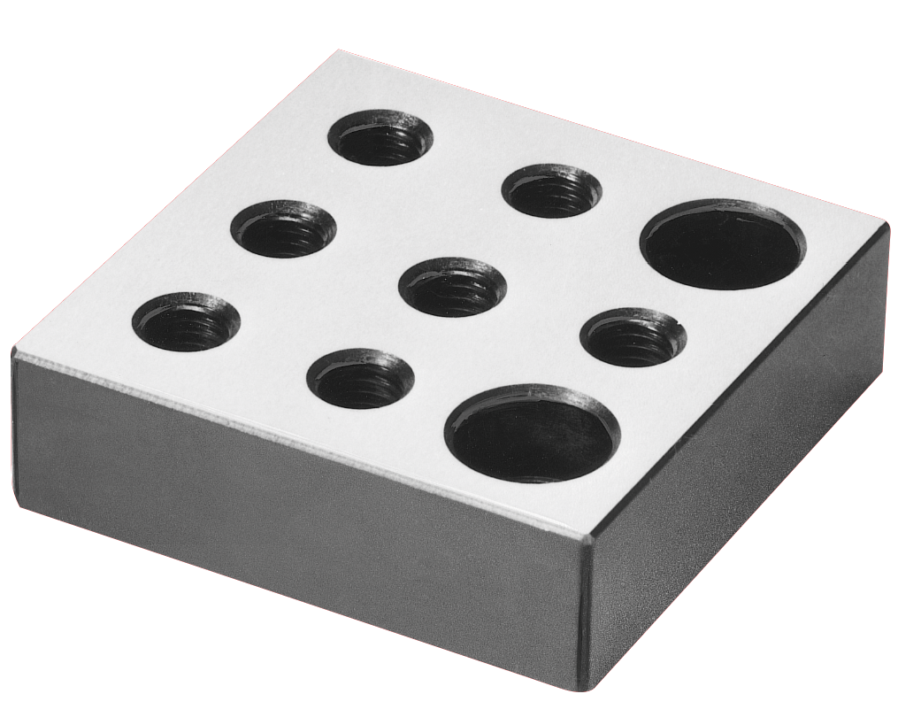 Riser blocks are used to achieve a certain support height. The additional tapped holes in the risers are for mounting further fixture elements.
