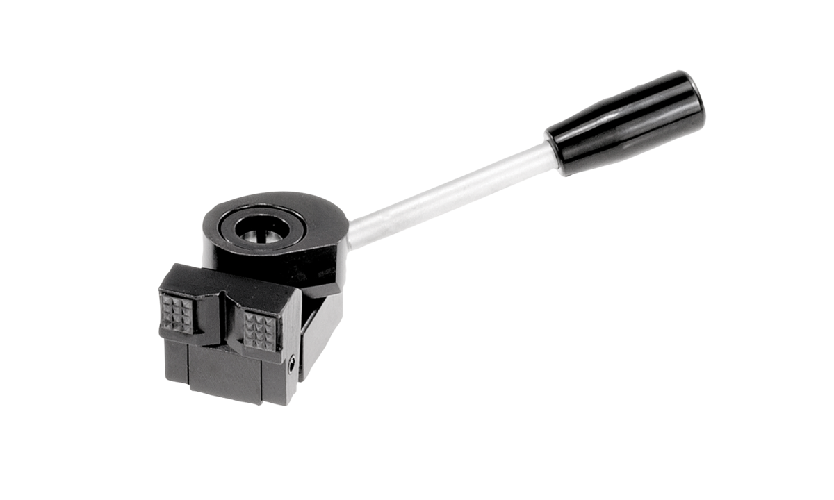 This is a quick-action side clamp where workpieces are clamped by rotating a cam wheel which exerts pressure on the swivel jaw, simultaneously producing a positive down force.