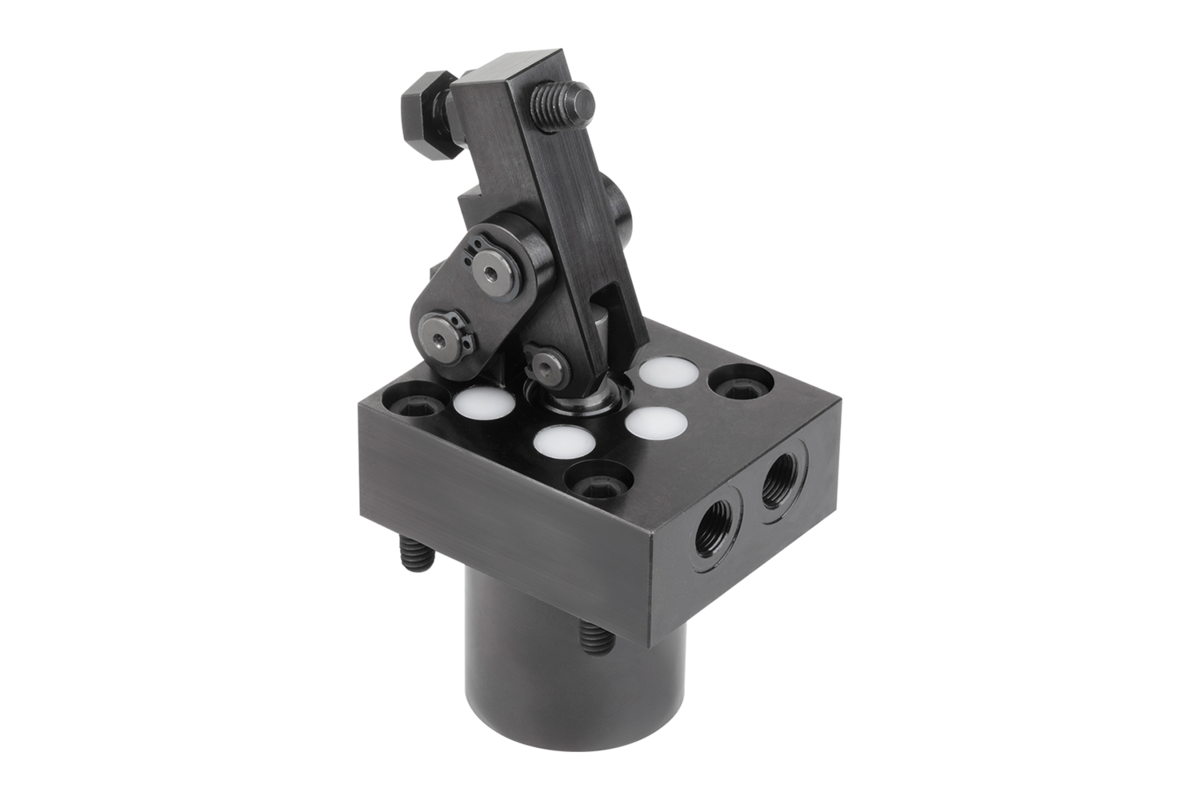 Link clamps are the optimal choice when, due to the clamping situation, the workpiece needs to be freely removed from above when unclamped. Due to the linear movement of the clamping lever when opening or closing the link clamp, it is particularly suitable for clamping situations where a lateral movement of the clamping element is not possible, e.g. due to interfering contours. The force is transferred to the tensioning lever of the link clamp via the piston. The opening and closing times are clearly defined due to the link clamps double-acting mode of operation.