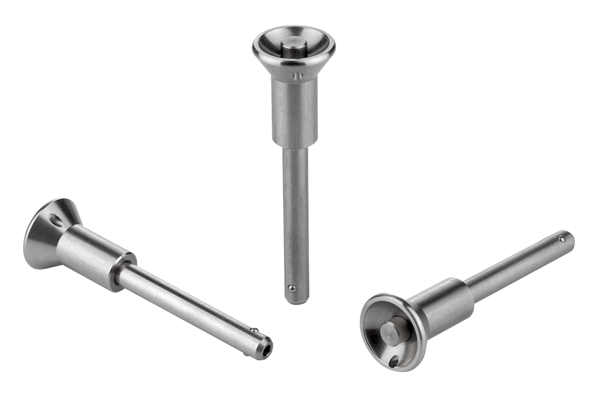 The two balls are disengaged by pressing the push button and the pin can be slipped into holes in the workpieces. When the push button is released, the balls lock the connection securely.