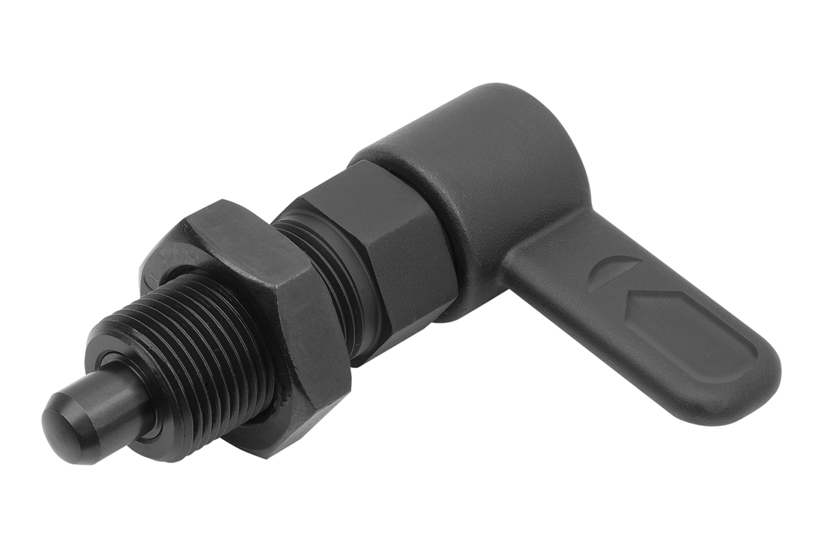 Cam-action indexing plungers are used where any change in locking position due to lateral forces should be prevented. Turning the grip through 180° retracts the indexing pin, enabling a change in the indexed position. The notch ensures that the grip remains in this position and the indexing pin remains retracted.