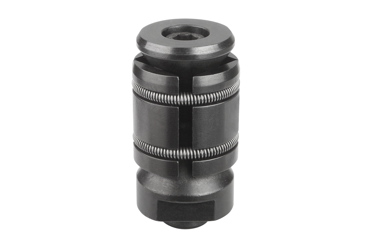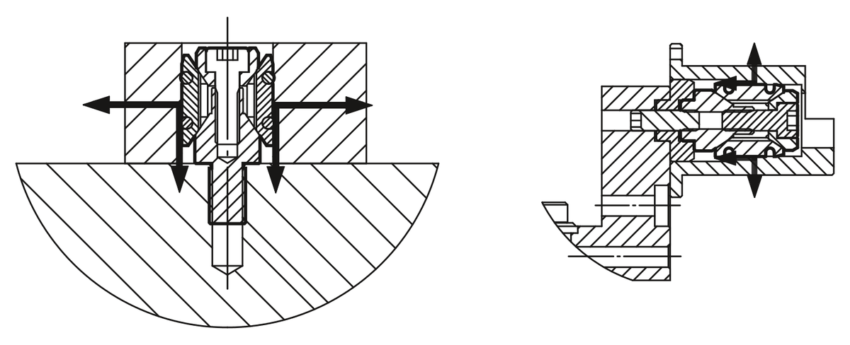 These centring clamps enable workpieces to be centred on and lightly clamped in a bore. The clamps have a wide expansion range. The series covers a bore range of Ø12 to Ø30 mm. To increase the centring accuracy the clamps with internal thread have a centring spigot (D2) for a locating hole. The centring accuracy is ±0.2 mm.