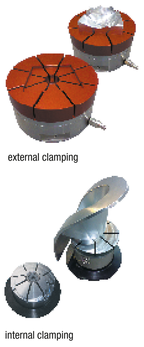 Collet for clamping external or internal contours. The contour of the workpiece to be clamped is imparted to the collet. Free-form surfaces and asymmetrical contours are possible.