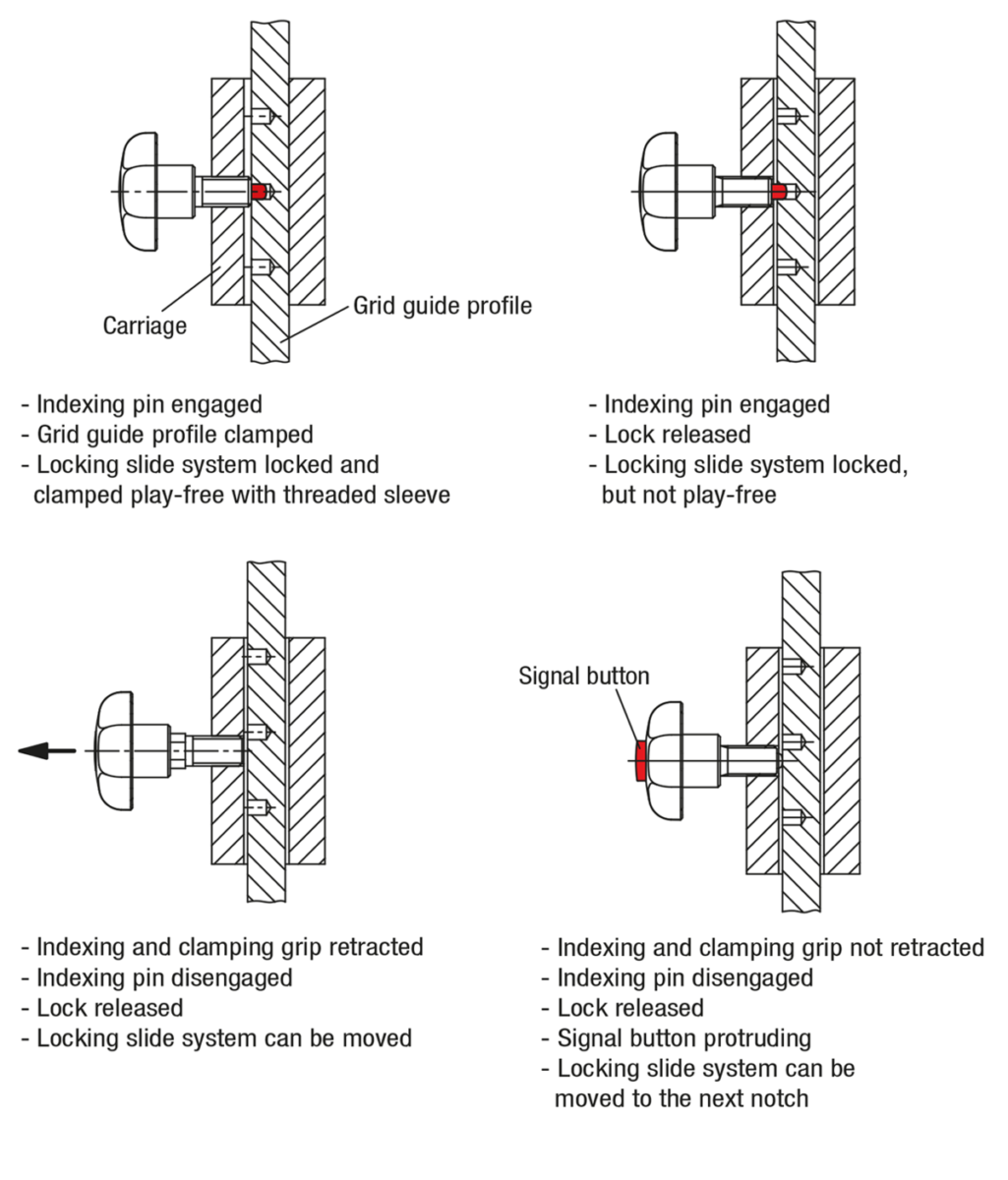 The indexing and clamping grips enable the positioning, securing and clamping of diverse positioning elements with just one product. Indexing is carried out using the indexing pin and the item is clamped using the end face of the sleeve.