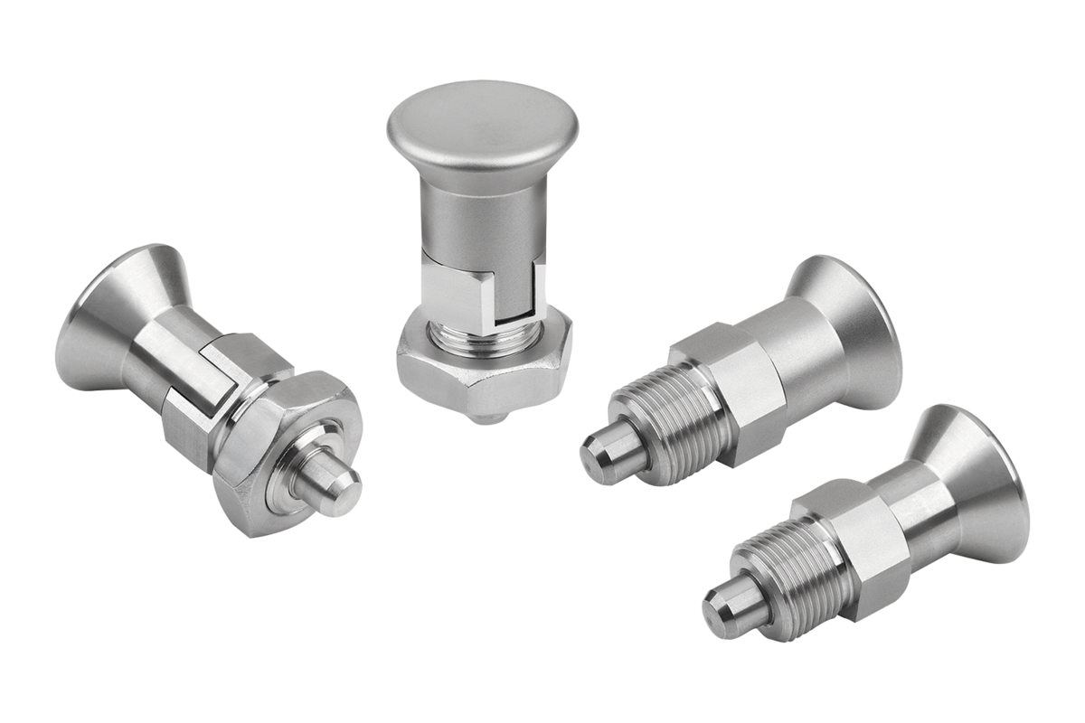 Indexing plungers, stainless steel, short version with stainless steel mushroom grip and locking slot