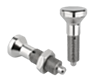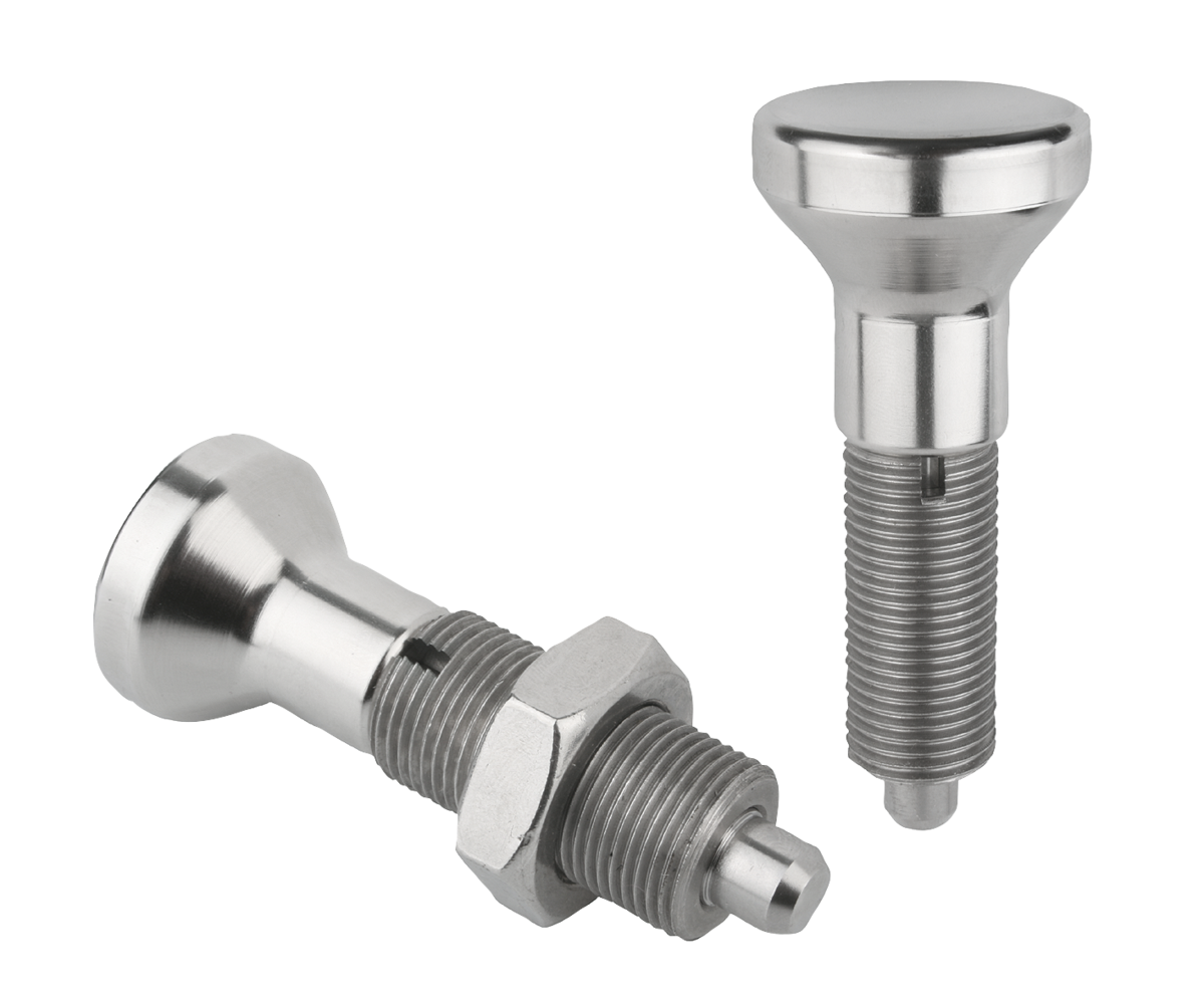 Indexing plungers, stainless steel, without collar, with stainless steel mushroom grip and locknut