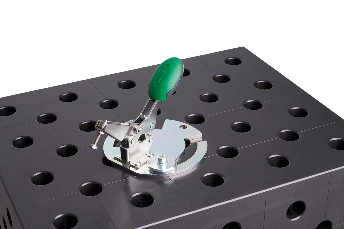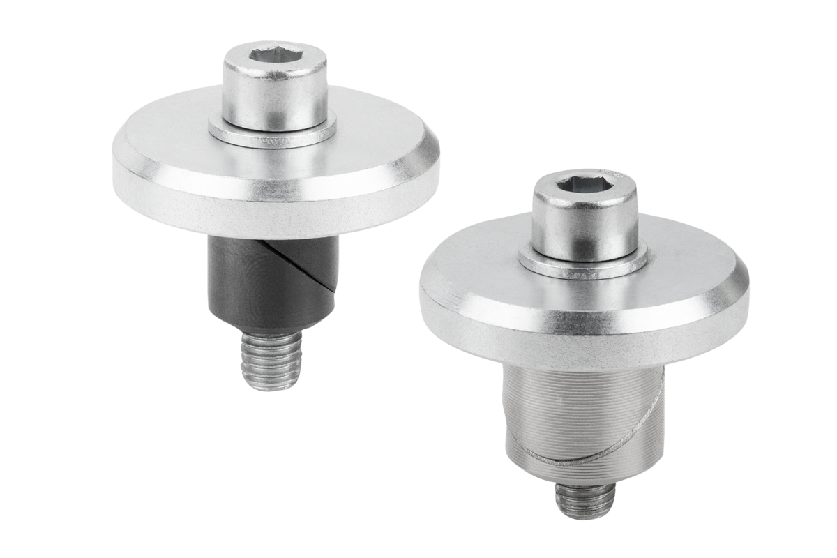 For fixating adapter plates, angles and plates open on grid hole tables or plates with Ø16 mm, Ø20 mm or Ø28 mm holes. Can also be used as a point end stop for positioning and fixating exchange clamping plates. By turning the cap screw, the lock wedges expand in the bore.