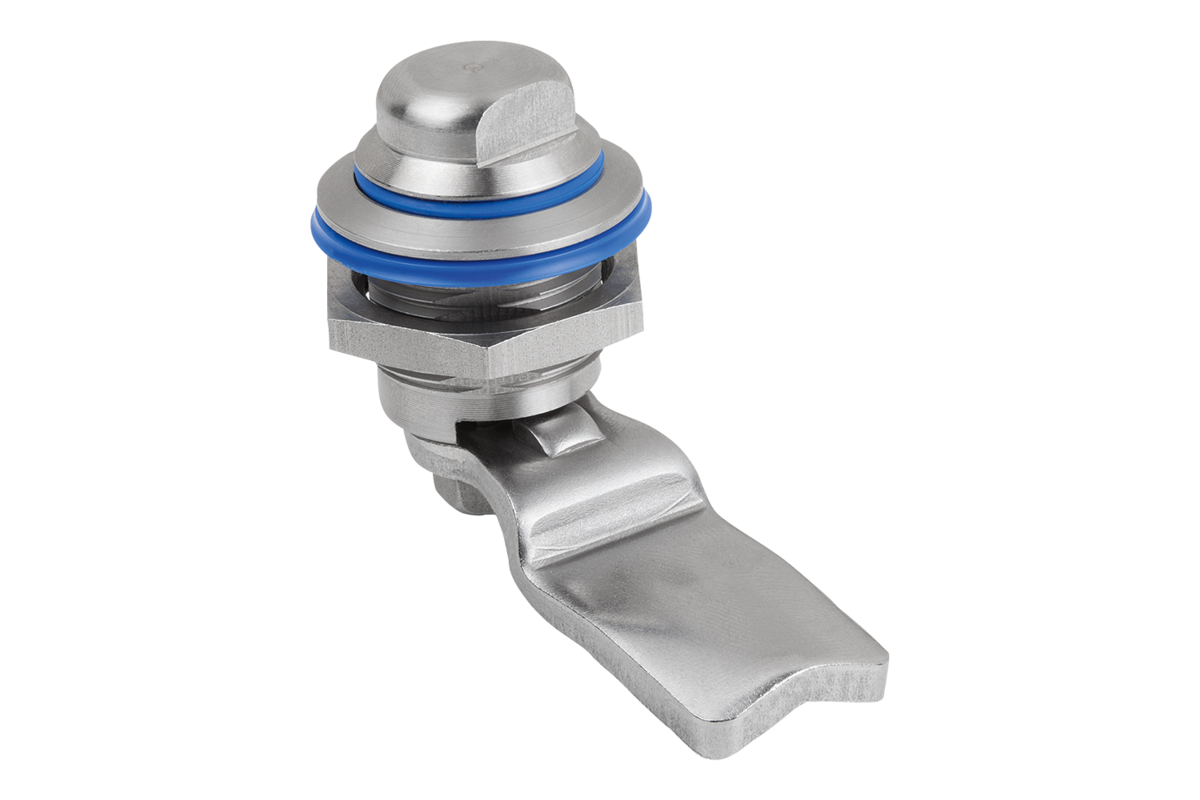 Stainless steel quarter-turn lock with 13 mm AF actuator for applications with hygienic requirements as per EN ISO 14159, EN 1672-2:2009*. Dust and waterproof as per IP69K. The rounded form and polished surfaces together with the material used make these locks insensitive to cleaning materials and resistant to dirt. The seal between the quarter-turn lock and the door is made using the captive PUR foam seal on the underside of the quarter-turn lock housing.