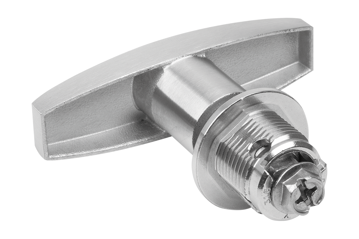 Quarter-turn lock with T-grip. For right or left mounting with 90° closing. The quarter-turn lock can be installed pre-assembled. Supplied with standard stainless-steel nut. The lockable quarter-turn locks are each supplied with 2 keys. Rating IP65.