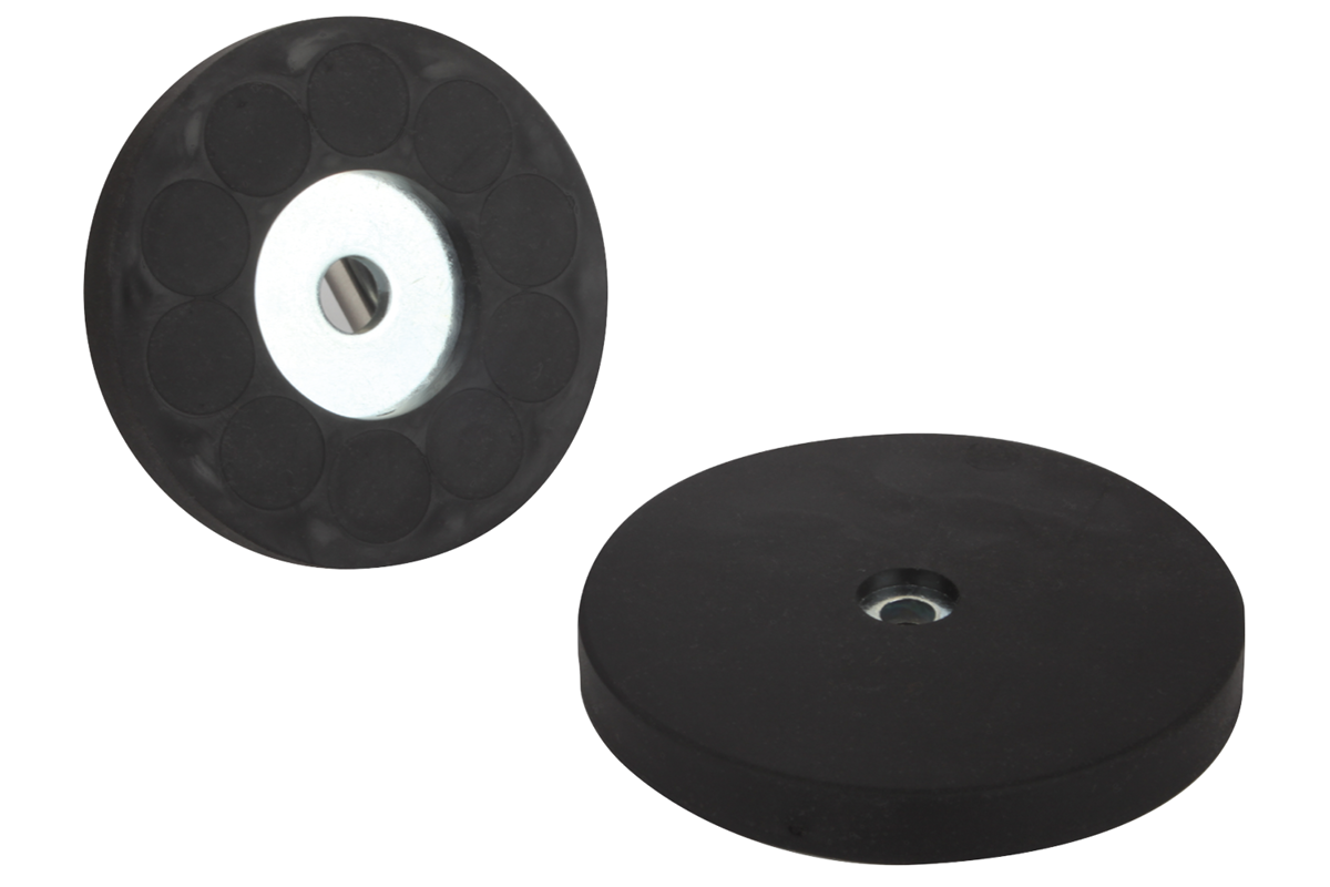 Shallow pot magnets, shielded system. With rubber protective jacket for protecting sensitive surfaces. The coefficient of friction is increased by the rubber jacket so that high lateral friction is achieved.