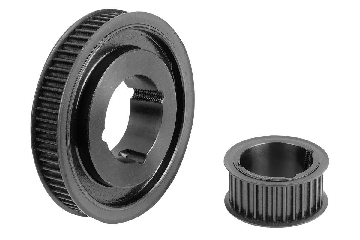 Standard HTD profile with metric pitch (rounded toothing). At least one toothed belt pulley must have a rim flange. Conical hole for taper clamping bushes. The taper clamping bushes must be ordered separately and are available for various shaft diameters. Pulleys with a taper hole are statically balanced as per ISO 1940 grade G16.