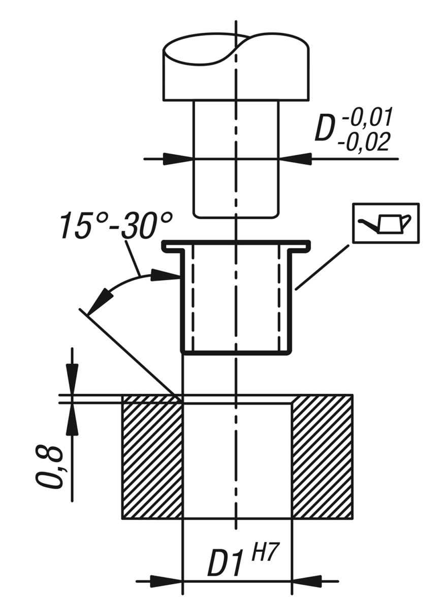 Press in plain bearings, do not hammer in. The use of a suitable press mandrel is advisable. Without a mandrel there is a risk that the bearing may deform during installation. After press-fitting into a housing with bore H7 the bore D has a H7 tolerance.