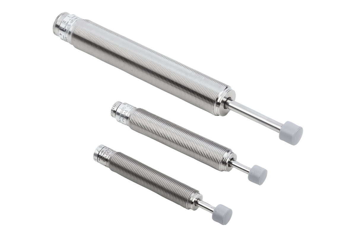 Industrial shock absorbers are maintenance-free, ready to install hydraulic components. They have an integrated fixed stop. The adjustable version enables precise adjustment to the desired dampening level. After installation, operate and adjust the shock absorber a few times until the desired braking level is achieved.