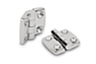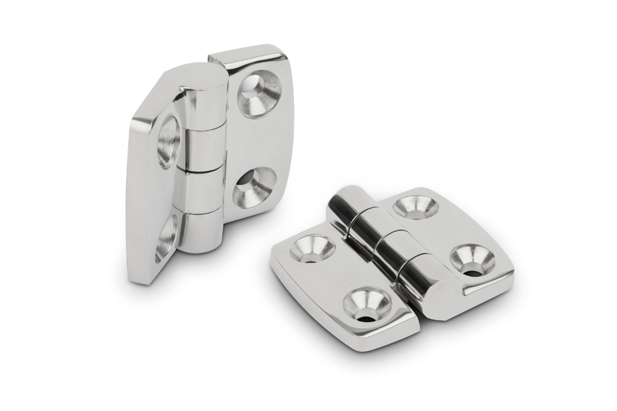 Hinge for panel elements and aluminium profiles, non lift-off. Pin end closed. Screws countersunk, thus minimum dirt accumulation.